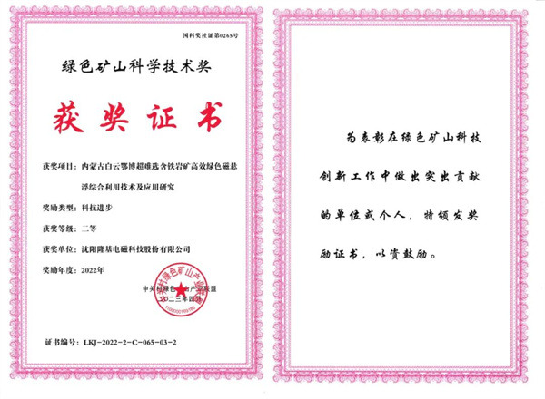由沈陽隆基電磁科技股份有限公司、包鋼集團礦山研究院(有限責任公司)、包鋼蒙普礦業有限責任公司共同完成的“內蒙古白云鄂博超難選含鐵巖礦高效綠色磁懸浮綜合利用技術及應用研究”通過“中綠盟”組織的科學技術成果鑒定,被認定為國際先進水平。